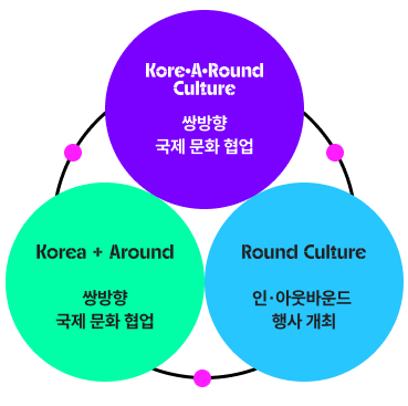 코리아라운드 컬처(Kore·A·Round Culture) 는 인아웃바운드 행사 개최를 의미하는 라운드 컬처(Round Culture) 와 한국을 거점으로 문화교류가 진행된다는 의미의 코리아 + 어라운드(Korea+Around) 를 결합한 명칭으로 쌍방향 국제문화협업 지원 사업을 의미합니다 .